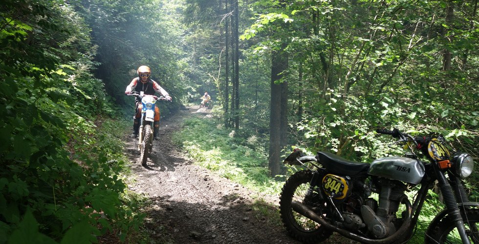 Die Abfahrt durch den Wald stellte nochmal alles in den Schatten. Die BSA verlangte mir volle Konzentration ab...scharfkantige Felsbrocken, so gross wie alte Fernseher und rutschige Wurzeln, zwangen die Fahrer, bergab noch Gas zu geben um nicht ständig aufzusetzen. An besonders brenzligen Stellen warteten zum Glück kundige Helfer, die einige Abstürze von Maschinen und deren Fahrer verhinderten.