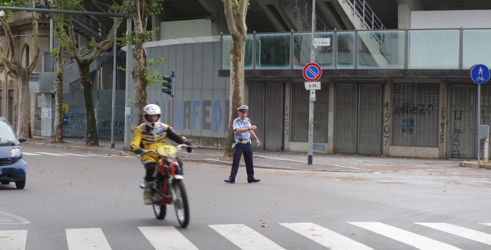 Es war super organisiert: Die Polizei sperrte bei jeder Gruppe kurzfristig die Strasse und winkte alle über rote Ampeln bis zum nächsten Kreisverkehr. Ab da den Schildern nach zur ersten Geländeprüfung auf einer Wiese am Autobahnzubringer. Man konnte die Bikes ja nicht sauber die nächsten 40 Kilometer bis ins Valli Bergamasche hinaufschicken...Es gab jede Menge begeistertes Publikum am Strassenrand. Biker des Moto Club Bergamo sammelten sich an jedem Kreisverkehr und passten auf, dass niemand verlorenging. Es gab sogar Geleit... Zeitkontrolle in Rovetta; 90 Minuten waren bis hier veranschlagt, doch es gab schon einige, die wegen Motorschaden aufgeben mussten.